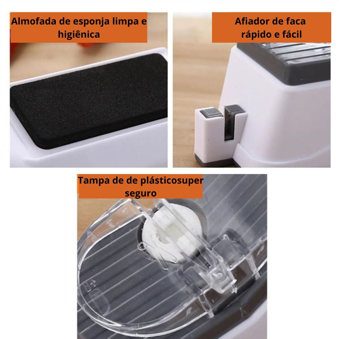 - Segurança em Primeiro Lugar: A base antiderrapante e a estrutura robusta garantem total estabilidade, mantendo suas mãos sempre seguras e longe das lâminas.